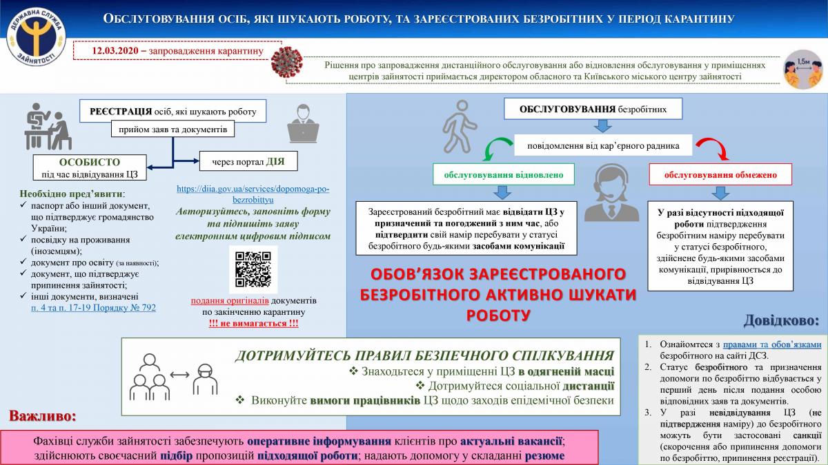 Під час воєнного стану Кабмін запровадив реєстрацію через портал або додаток «Дія» чи електронні сервіси служби зайнятості. Щоб стати на облік і отримати офіційний статус безробітного, потрібно надати документи: паспорт громадянина України або ID-картку (довідку про місце реєстрації).