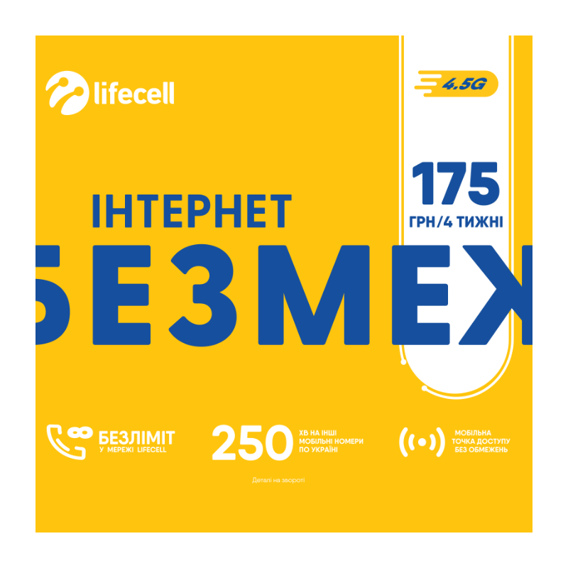 Стартовий пакет Lifecell Просто Лайф Перший місяць користування оплачений! Вартість підключення Абонентська плата 90,00 грн. Термін дії абонплати 28 днів Вартість дзвінків Пакетні хвилини на дзвінки абонентам в межах України 250 хв. Вартість дзвінків понад пакетних хвилин всередині України 0,60 грн./мін.